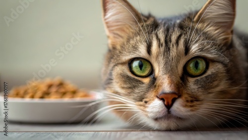 A close-up of a cat looking curiously at a bowl of food, featuring striking green eyes and a soft fur texture.