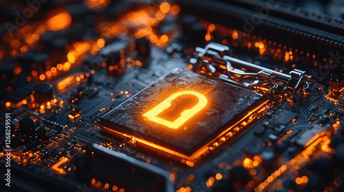 A close-up of a circuit board featuring a glowing padlock symbol.