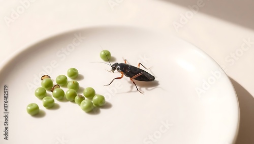 A close-up of a cockroach perched on a green peas resting on a spotless white plate, underscoring food safety concerns, hygiene challenges, and pest control problems