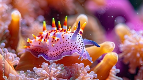 A close-up of a colorful sea slug navigating through a garden of vibrant coral polyps