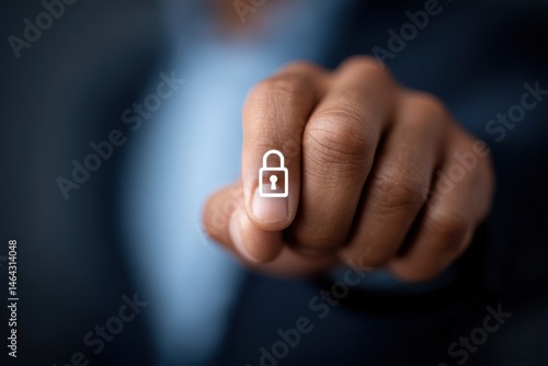 A close-up of a confident young man holding a digital lock icon on his fingertip symbolizing cybersecurity innovation and digital safety measures in today's technology-driven world