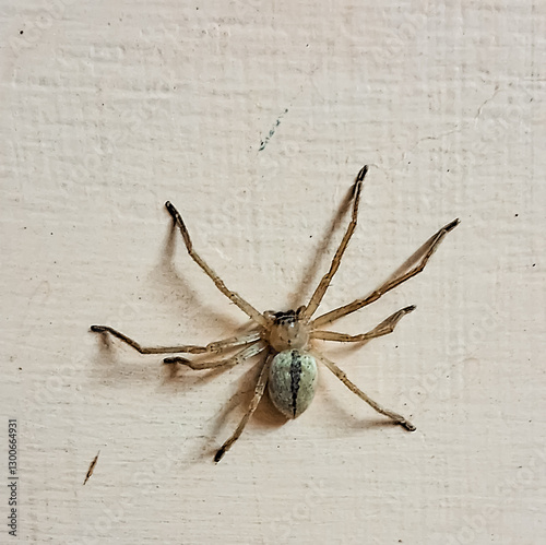 A close-up of a crab spider on a textured white wall, showcasing its pale body, long legs, and distinct dark stripe on its abdomen.