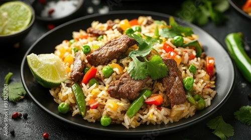 food, meal, dinner, lunch, asian, cookery, chinese, japanese, korean, thai, vietnamese, stir fry, rice, beef, vegetable, green beans, pea, red pepper, yellow pepper, cilantro, garnish, plate, black, background, closeup, macro, texture, savoury, delicious, appetising, healthy, fresh, tasty, favor, aromatic, spicey, vibrant, colourful, culinary, eatery, eat, cooking, diet