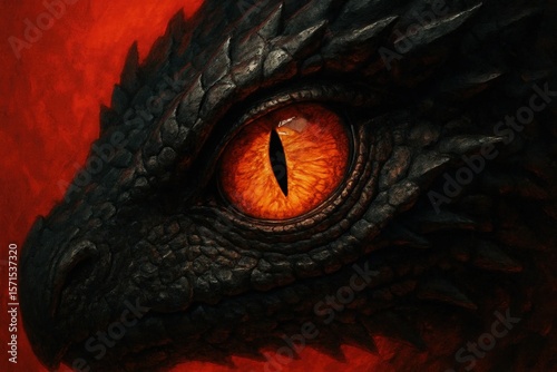 A close-up of a dragon's eye, radiating an intense orange hue against a fiery red background