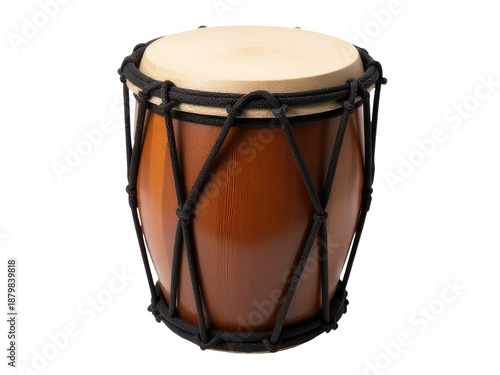 A close-up of a drum with a wooden top on a plain white background, ideal for use in music-related projects or as a design element