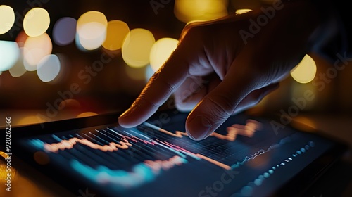 A close-up of a financial consultants hand pointing at a tablet graph, illustrating market performance.