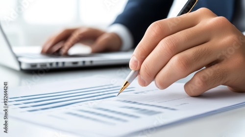 A close-up of a hand entering data into a financial spreadsheet, with a laptop and documents in the background, copy space for text, high-resolution photo, realistic photo