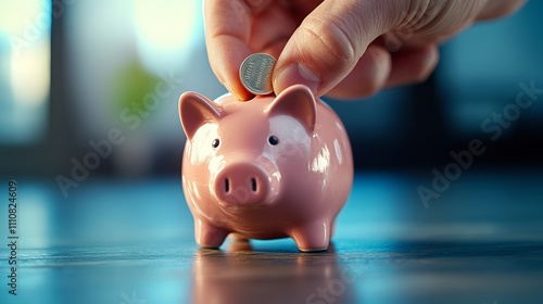 A close-up of a hand placing a coin into a pink piggy bank, symbolizing savings and financial planning in a warm, inviting atmosphere.