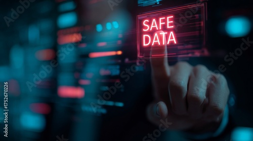 A close-up of a hand pressing a button labeled 'SAFE DATA' illuminated in bright red on a digital interface, representing cybersecurity.