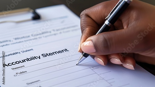 A close-up of a hand signing an official document with a serious expression, representing personal accountability for actions, Accountability
