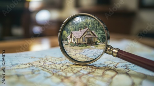 A close-up of a magnifying glass placed over a map, highlighting a house, representing the process of searching for a new home.