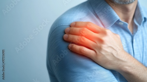 A close-up of a man experiencing shoulder pain. He gently touches his shoulder, expressing discomfort and concern.