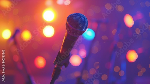 A close-up of a microphone stand adorned with colorful stage lights, ready to amplify the voice of the next musical sensation.