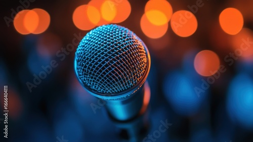 A close-up of a microphone with a blurred background of colorful lights, emphasizing its mesh grille and sleek design, perfect for capturing sound.