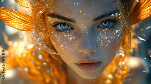 fantasy, beauty, underwater, magic, aethereal, portrait, shimmer, aquatic, vibrant, enchanting, surreal, expression, elegance, light, colours, detail, mesmerizing, character, creative, artistic, nature, ocean, dreamlike, whimsical, serene, captivating, allure, face, fantasy art, glowing, sparkling, hair, skin, freckle, blue, orange, mystical, imaginative, visual, stunning, alluring, depth, portraiture, charme