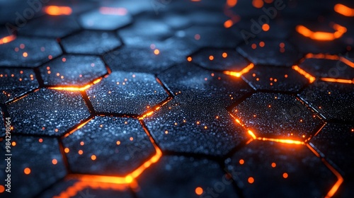 A close-up of a nanotechnology-based carbon surface with glowing hexagonal geometric forms