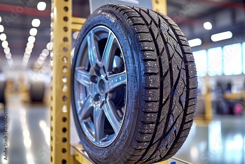 A close-up of a new car tire on a metal rack in a warehouse, highlighting the tire's tread pattern and shiny silver rim under bright factory lighting.