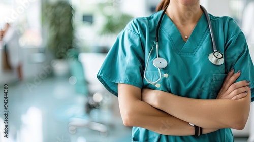 A Close-Up of a Nurse's Arms Crossed, Wearing a Teal Scrubs and a Stethoscope