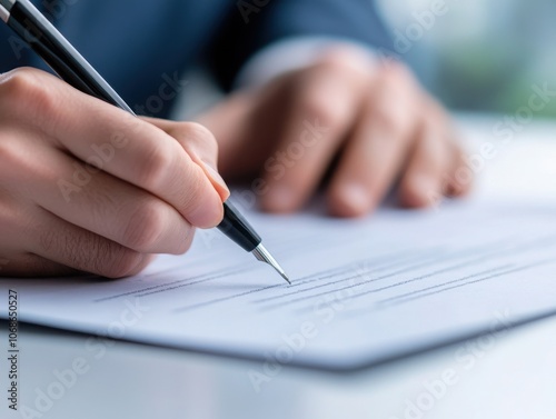 A close-up of a person's hand writing on a document with a pen, showcasing professionalism and attention to detail.