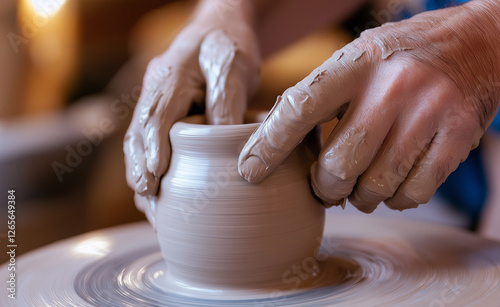 A close-up of a potter's hands shaping a clay vase on a spinning wheel, highlighting craftsmanship, creativity, and traditional artistry.