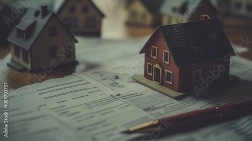 A close-up of a real estate market graph with houses and a pen, symbolizing sadness or self-reflection, featuring a rubber band and a miniature house model placed over documents