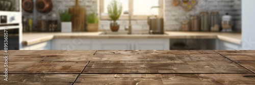 A close-up of a rustic wooden tabletop in a modern kitchen setting, perfect for showcasing products. The blurred background features white cabinets, a window, and a countertop, creating a clean and in
