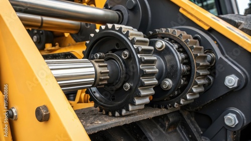 A closeup of a telehandlers articulated joint revealing the complex hydraulic system and gears. The interplay of metal and grease highlights the engineering excellence behind the