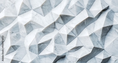 A close-up of a textured, geometric white marble surface with sharp, angular facets creating a three-dimensional abstract pattern.