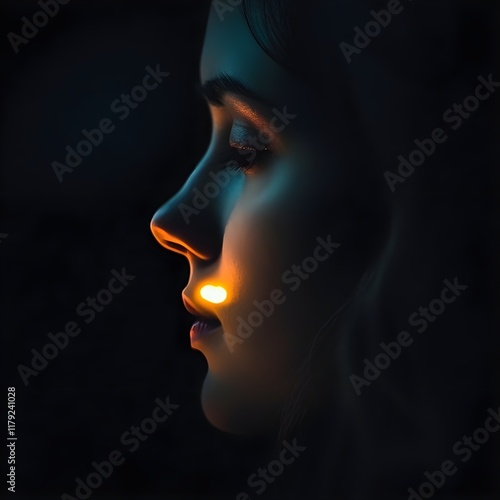 A close-up of a woman with her face illuminated by a flickering candle in the dark.