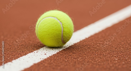 A close-up of a yellow tennis ball resting on the white line of a red clay court. A macro shot of sports equipment.