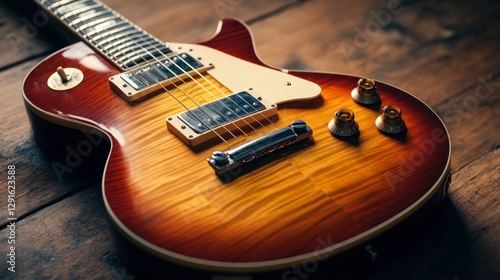 A close-up of an electric guitar, resting on a wooden surface with space for text or product placement. The body is in the foreground
