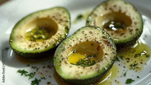 A close-up of avocados drizzled with olive oil and sprinkled with herbs, beautifully captured on a bright white plate for a gourmet touch