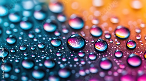 A close-up of colorful water droplets on a surface, displaying vibrant reflections and a mesmerizing blend of hues.