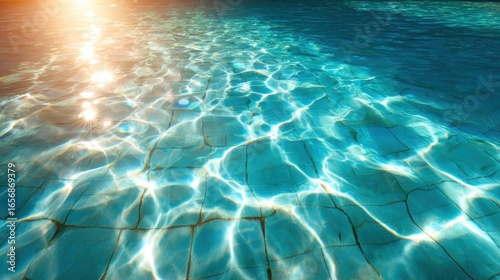 A close-up of crystal-clear swimming pool water glistening under the bright sun, creating a captivating visual of rippling reflections and a sense of refreshing relaxation.