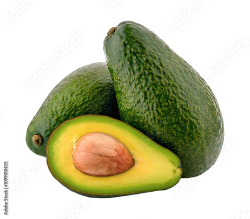 A close-up of fresh avocados, with whole fruit and a halved fruit, highlights their ripeness, freshness, and juicy texture.
