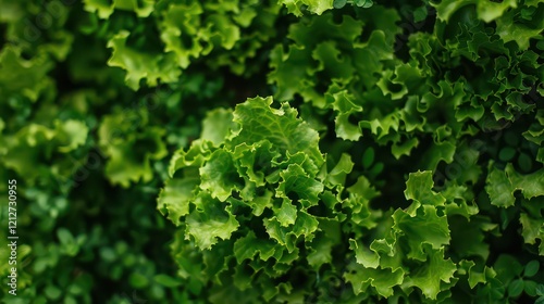 A close-up of green lettuce growing in neat rows on an organic plantation
