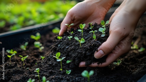 A close-up of hands holding rich, dark compost with small plants growing, macro shot, in a backyard garden, detailed and organic composition, with soft diffused lighting