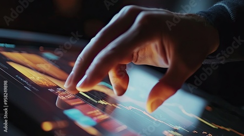 A close-up of hands interacting with a touch screen, manipulating a dynamic business graph and analyzing real-time data.