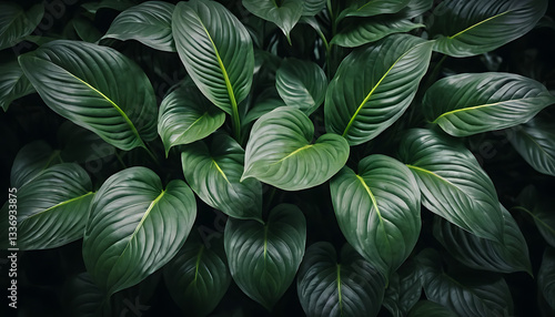 "A close-up of lush, dark green tropical leaves with a smooth texture and prominent veins. The moody lighting enhances the depth and richness of the foliage, creating a dramatic and elegant botanical