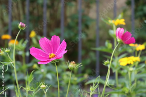 A close-up of pink and yellow cosmos flowers in full bloom, with a blurred green background.