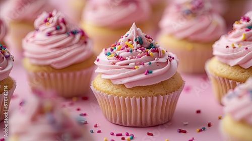 A close-up of pink frosted cupcakes with sprinkles arranged on a pastel pink surface, creating a sweet, celebratory vibe.