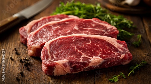 A close-up of premium beef cuts glistening with freshness, displayed on a rustic wooden table with a knife and herbs in the background for a home-cooked feel.