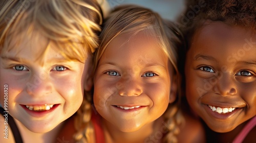 closeup, of, three, children, different, skin, tone, smiling, joyfully, natural, lighting