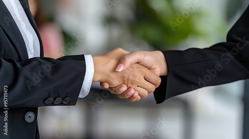 A close-up of two business professionals shaking hands in an urban setting, symbolizing successful partnerships, agreements, and cooperation