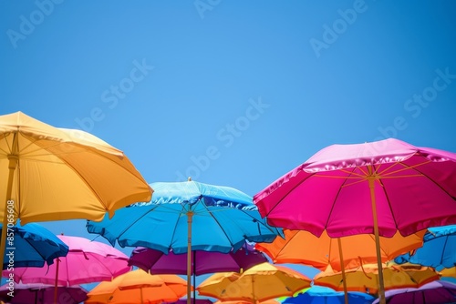 A close-up of vibrant beach umbrellas against a clear blue sky