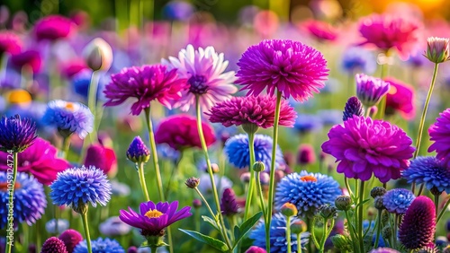 A close-up photo capturing the intricate details of a vibrant field showcasing various gorgeous flowers and plants, perfect for nature enthusiasts and designers seeking inspiration.