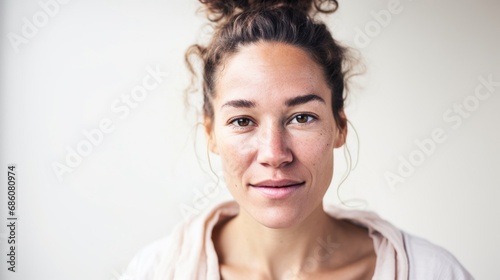 A close-up portrait featuring a Caucasian woman with flaws on her skin, posed against a light beige studio background.