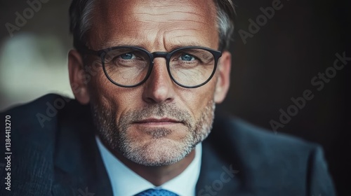 A close-up portrait of a confident business professional in a suit, featuring glasses and a serious expression, ideal for corporate branding, consulting services, or leadership content,