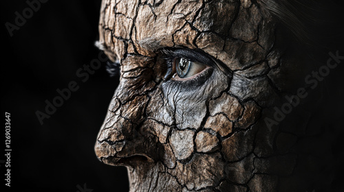 A close-up portrait of a human face partially obscured, with cracked, parched skin texture