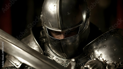knight, armoring, mediaeval, warrior, sword, helmet, metal, steel, battle, war, history, fantasy, closeup, portrait, face, expression, serious, determined, protective, strength, power, courage, bravery, chivalry, noble, ancient, dark, shadow, light, sharpened, detail, sharp, dramatic, intensity, closeup, background, dark background